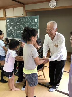 この日は、「地域に住む子どもたちにぜひ来てほしい」という希望をお聞きし、仕七川地区の小学校へ通っている児童館の児童を中心に古味サロンを訪れ、出前カフェ持参し、食事やゲームで交流を深めました。「○○さんとこの○○ちゃんじゃな。大きなったなぁ」と目を細める姿や、ゲームや昔遊びを童心に返って楽しむおじいちゃん、おばあちゃんの姿が見られました。すっかり仲良くなり、気がつくと子どもたちがその場にあった黒板に、みんなの似顔絵を描いてプレゼントする場面もありました。